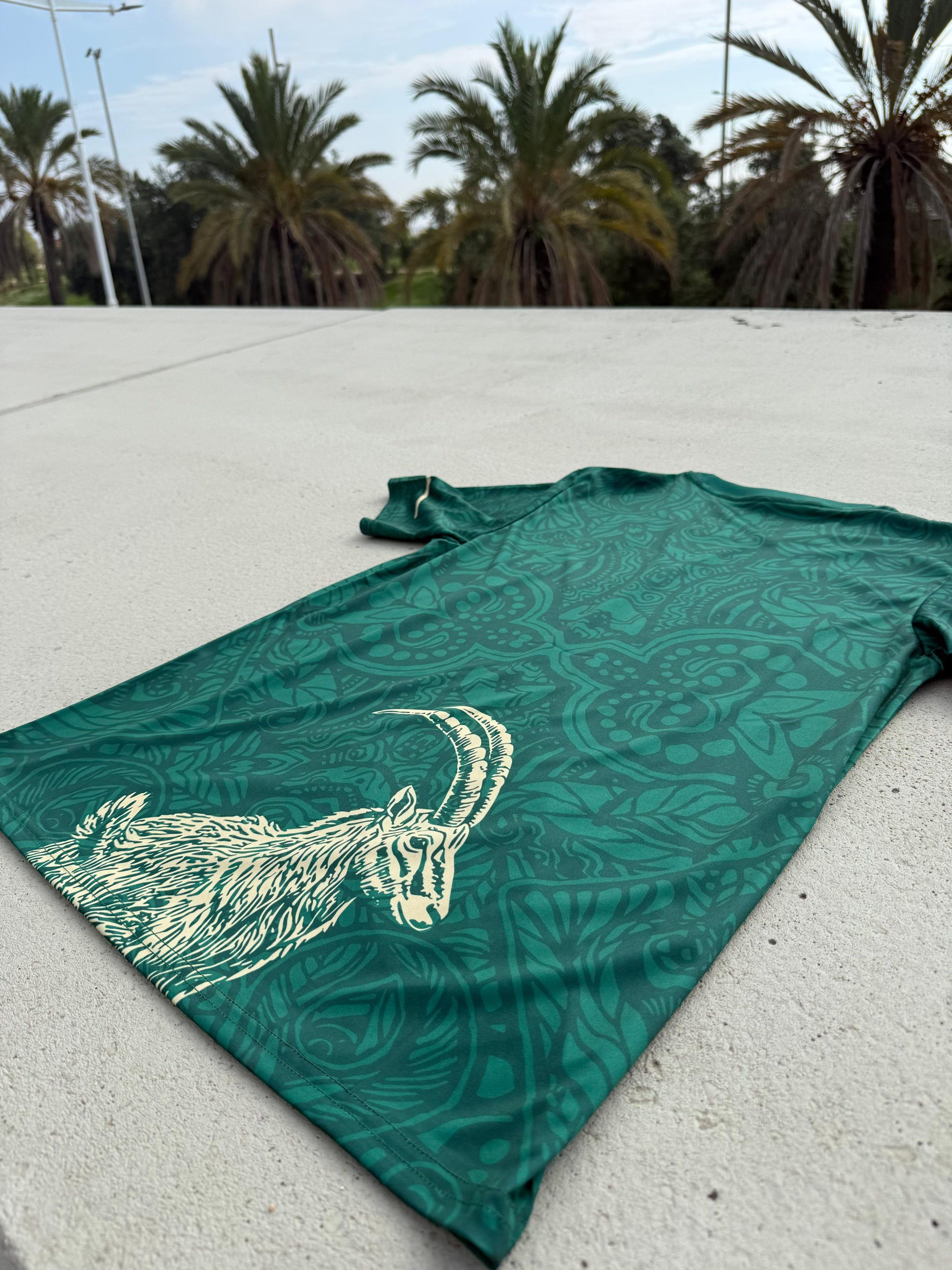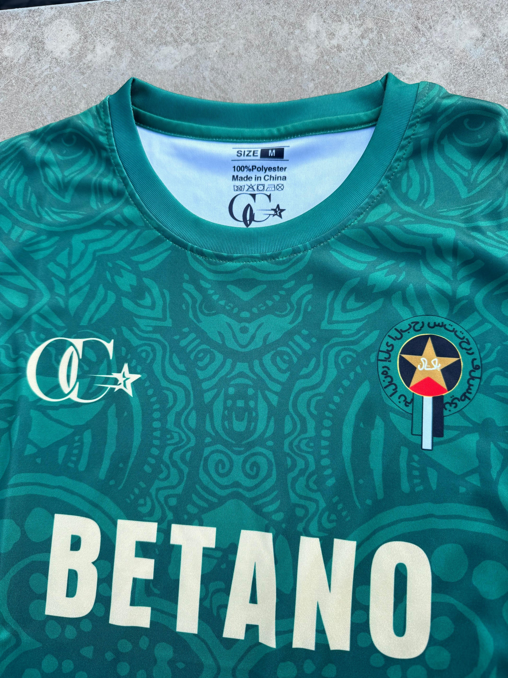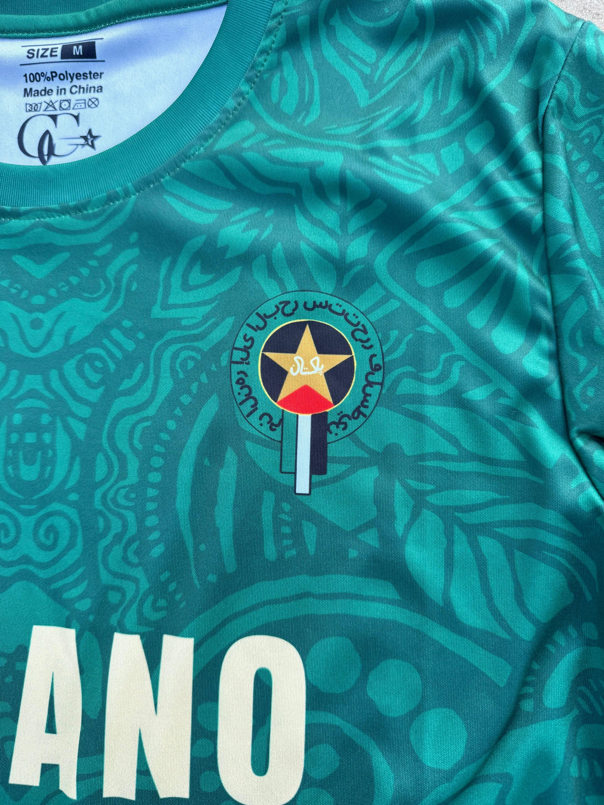 This jersey is inspired by Pakistan’s rich culture and natural heritage, featuring the iconic markhor—the national animal of Pakistan—illustrated on the back to symbolize strength and resilience. The deep green design is enhanced with traditional patterns and gold details, reflecting elegance and identity. On the chest, the badge blends Palestinian and Pakistani elements, representing solidarity and unity between both nations. Each detail offers a unique story, making this a meaningful garment that connects sport, culture, and international friendship.