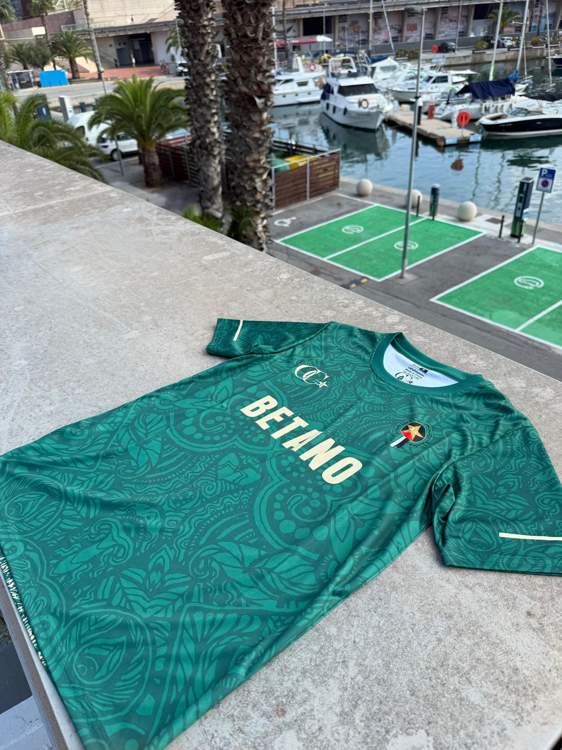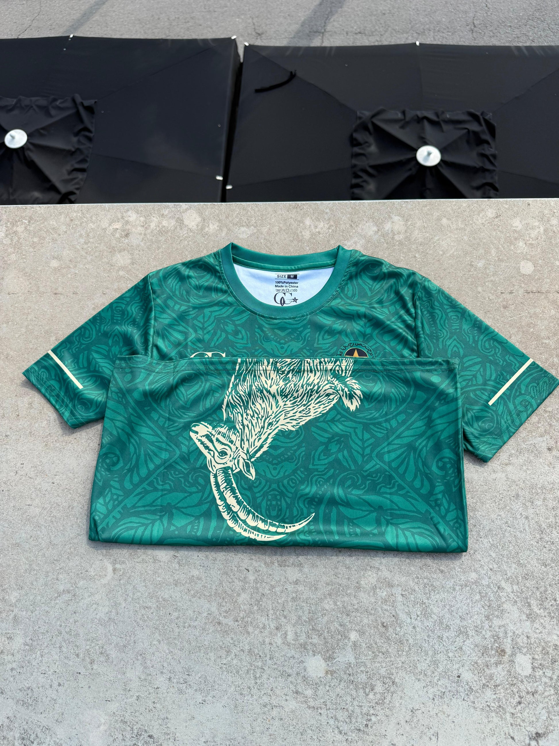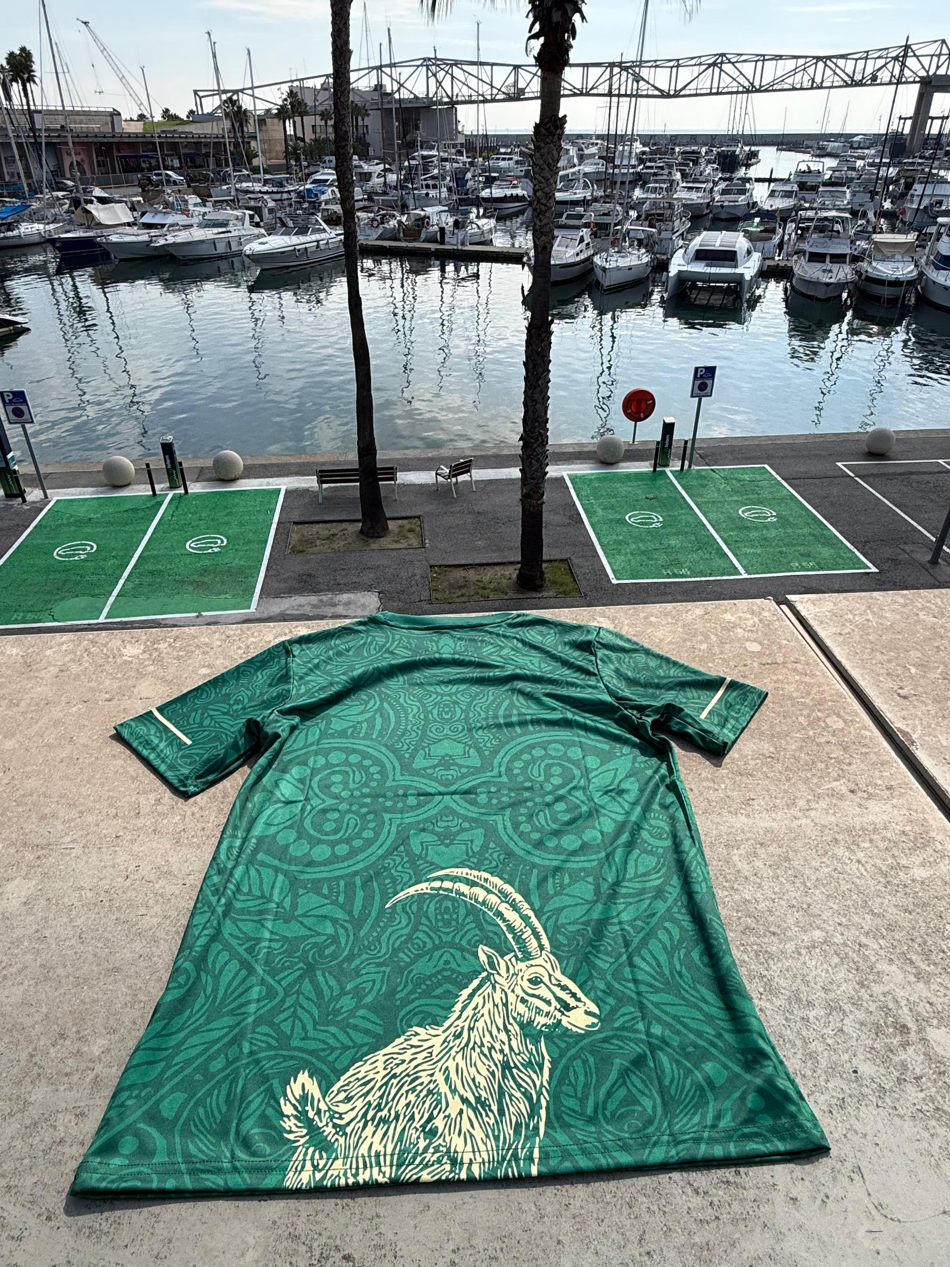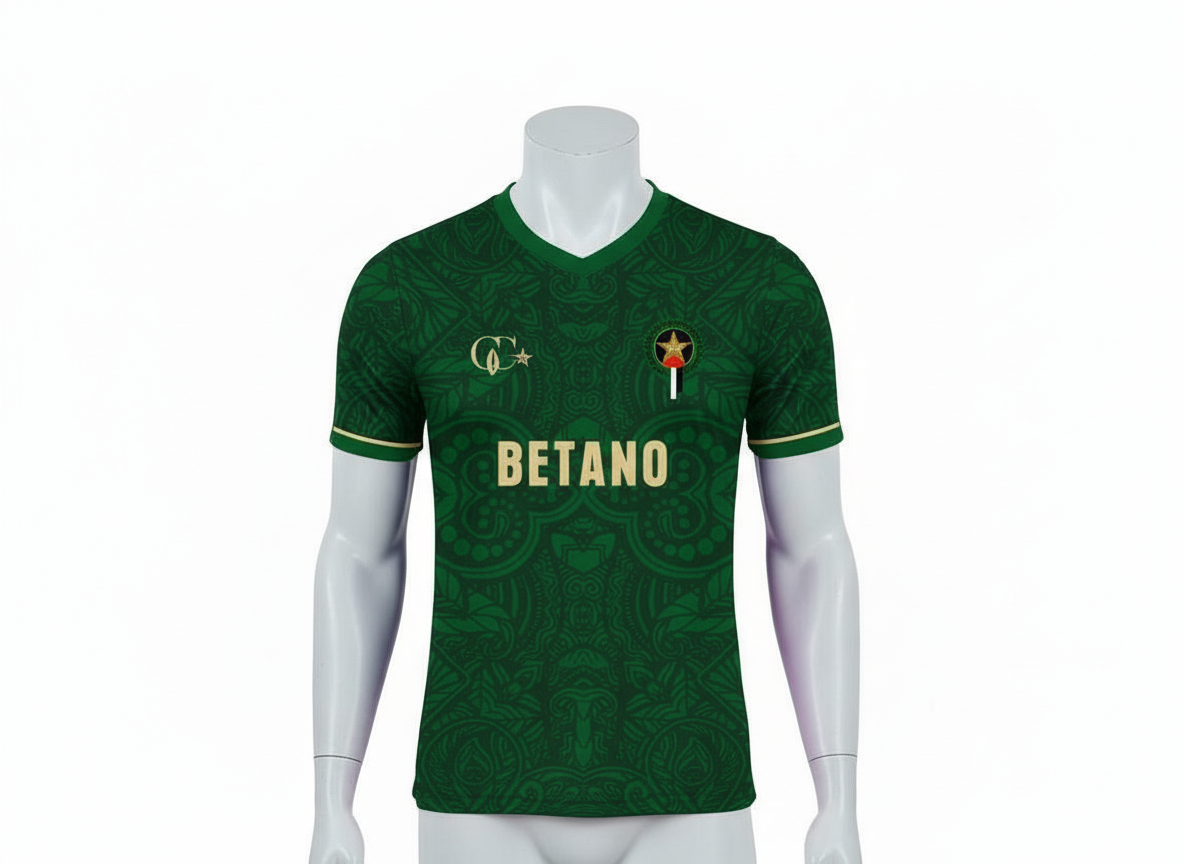 This jersey is inspired by Pakistan’s rich culture and natural heritage, featuring the iconic markhor—the national animal of Pakistan—illustrated on the back to symbolize strength and resilience. The deep green design is enhanced with traditional patterns and gold details, reflecting elegance and identity. On the chest, the badge blends Palestinian and Pakistani elements, representing solidarity and unity between both nations. Each detail offers a unique story, making this a meaningful garment that connects sport, culture, and international friendship.
