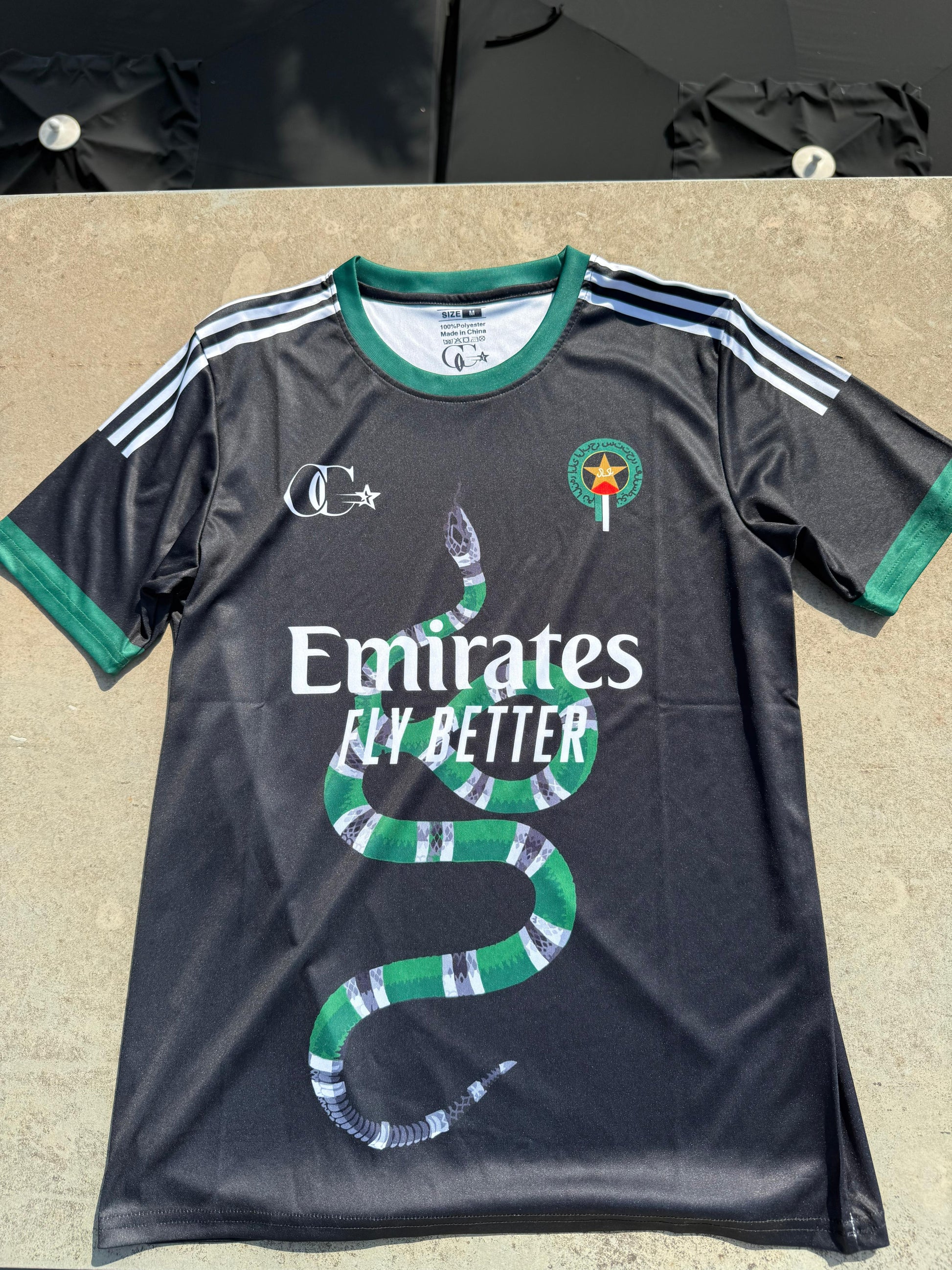 This black jersey merges symbols of resistance and cultural unity, featuring a stylized snake in green and white winding across the front, symbolizing strength and determination. It includes a combined Palestine-Pakistan badge on the chest along with the central sponsor "Emirates Fly Better" for a modern touch. The Arabic phrase on the back, written in a metallic iridescent color that changes with the light, reinforces the spirit of freedom: من النهر إلى البحر ستتحرر فلسطين("From the river to the sea, Palestine will be free"), making this garment a unique statement of identity, pride, and solidarity.